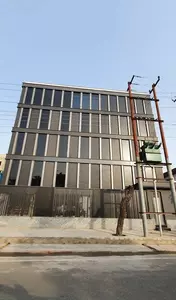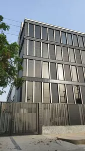 The factory building for M/s Interior Crafts in Noida is a meticulously designed serviced block covering approximately 6000 sqm on a 2000 sqm site. Tailored to accommodate the company’s work floors, offices, and showrooms, the structure features two interconnected blocks with a central courtyard. This innovative design enhances the building's functionality by separating work activities, allowing ample natural light, and creating a versatile activity space. The front block showcases a striking aluminum façade treatment, complemented by a garden integrated into the upper part of the façade, adding a touch of greenery and sophistication. The central courtyard not only extends the building’s skin area but also serves as a vibrant space that bridges the two blocks, fostering an open and dynamic environment for both work and interaction.